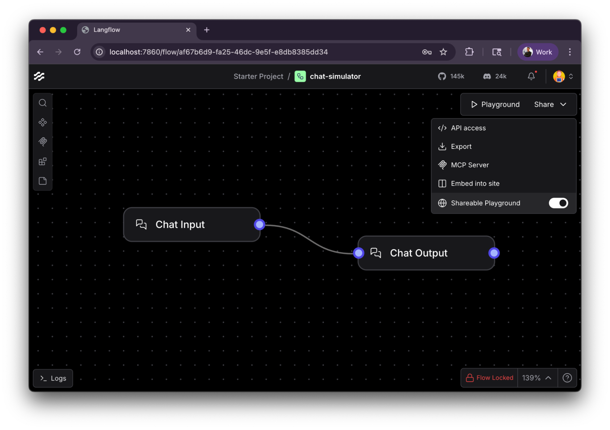 To create a proof of concept of the vulnerability, I installed Langflow with default options and created the most simple workflow I can imagine: chat input = chat output.